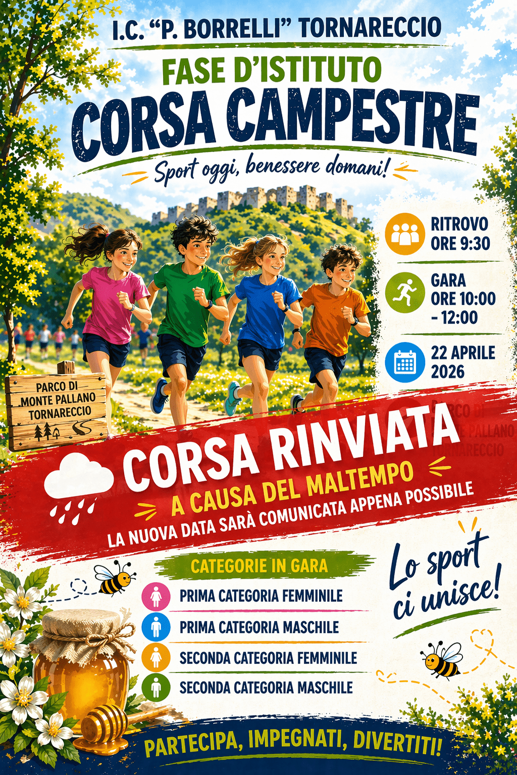 Si informano le famiglie e gli alunni che, a causa delle condizioni meteorologiche avverse, la fase d’Istituto di corsa campestre dell’I.C. “P. Borrelli” di Tornareccio, prevista per il giorno 22 aprile 2026 presso il Parco di Monte Pallano, è rinviata a data da destinarsi.